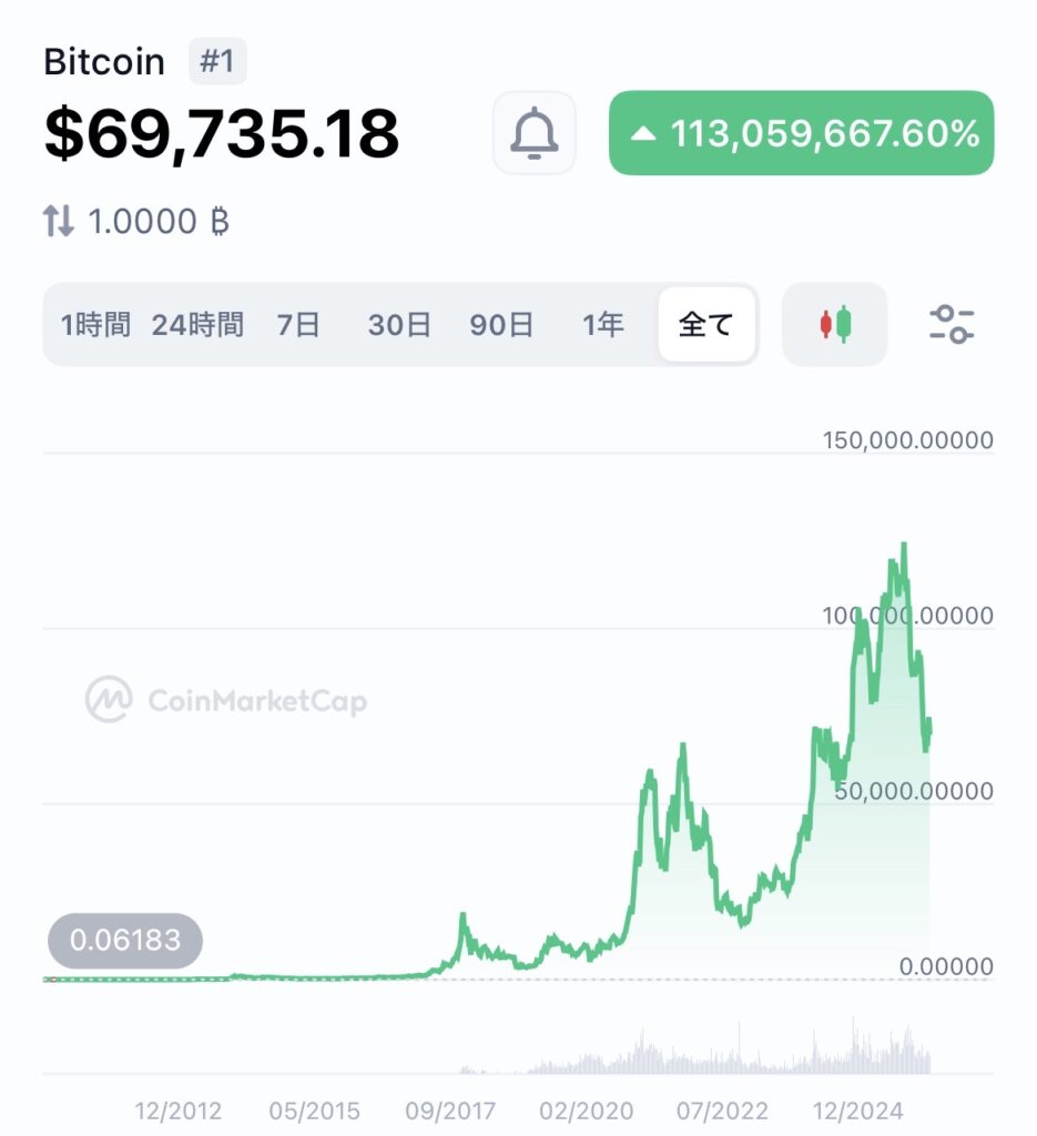 ビットコインも同じ傾向があります。4年に1度「半減期」というイベントがあり、コインの新規発行量が半分になる。供給が減る時期に需要がそのままか増えれば価格は上がります。実際にビットコインは過去10年で何度も爆上がりを繰り返しながら、大きくは右肩上がりを続けてきました。