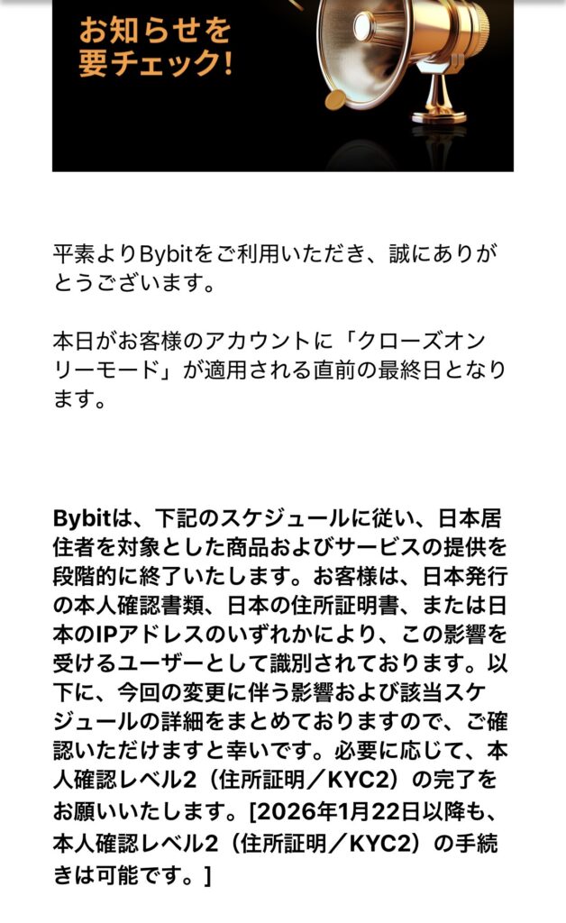 でも正直、おじさんには使いにくかった。送金ひとつするのに仮想通貨ブログとタブを行ったり来たり見くらべながら、一つひとつ確認していく必要がありました。そして2025年末、Bybitは日本ユーザーの取引を突然停止しました。